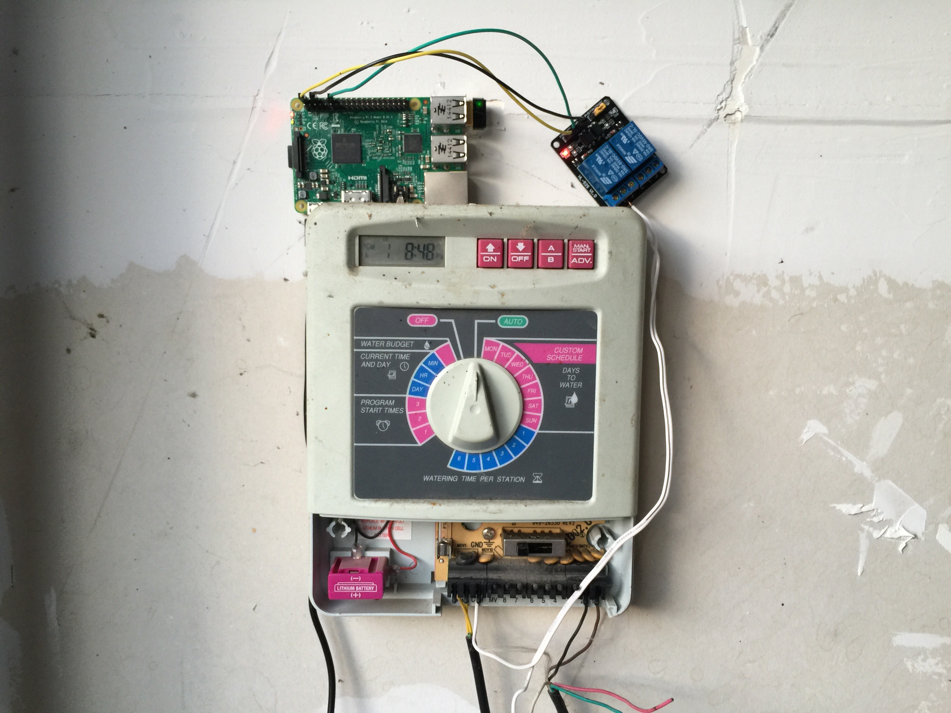 The two white wires leading away from the solenoid are in series with the 12V power supply and out of the picture they lead into a relay attached to a Raspberry Pi.  The Pi controls the relay, which in turn completes the circuit with the 12V supply and the solenoid, thus opening it, and allowing water to flow through the soaker hose.