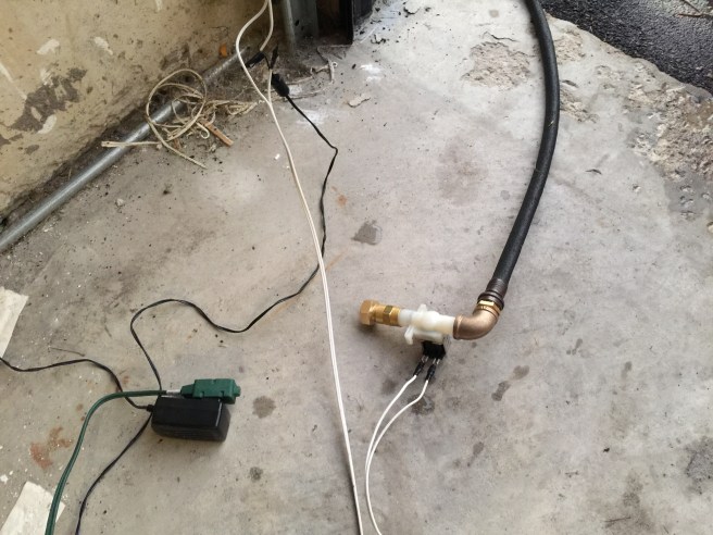 So a month or so ago I finally setup an automated sprinkler to soak the grass between the neighbours house and ours, where we had no sprinkler system already.  Once I had a little time, this surprisingly easier than I expected.  Basically it required a water solenoid to control the flow of water, some adapters from the 3/4″ standard hose to the 1/2″ of the solenoid, and 12V power to trigger opening the solenoid (by default closed).  Using the previous code I used for a rain by-pass, I used it to do the opposite: open the solenoid when there was no rain in the forecast vs the bypass which would break the circuit of the sprinkler when there was rain in the forecast.